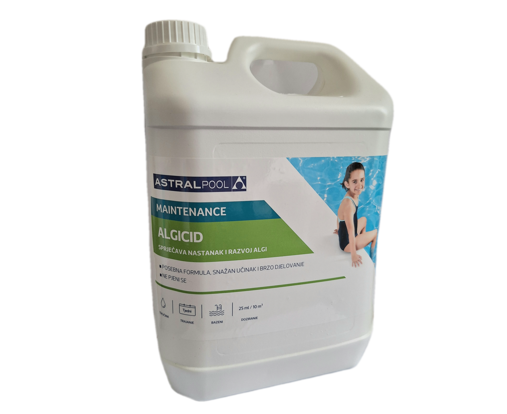 Održavanje: Dodati 0.25 l algicida na 100 m3 vode svaki tjedan. Početni tretman treba ponoviti uvijek kada bazenska voda nije prozirna. Ova uputa za korištenje samo je smjernica i može se mijenjati u skladu s karakteristikama bazena, klime ili okoliša.